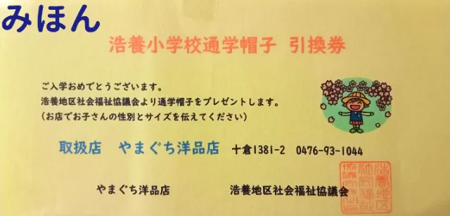 浩養小学校新1年生に浩養地区社協から通学帽をプレゼントしています。今年も入学説明会で保護者に引換券が配布されます。