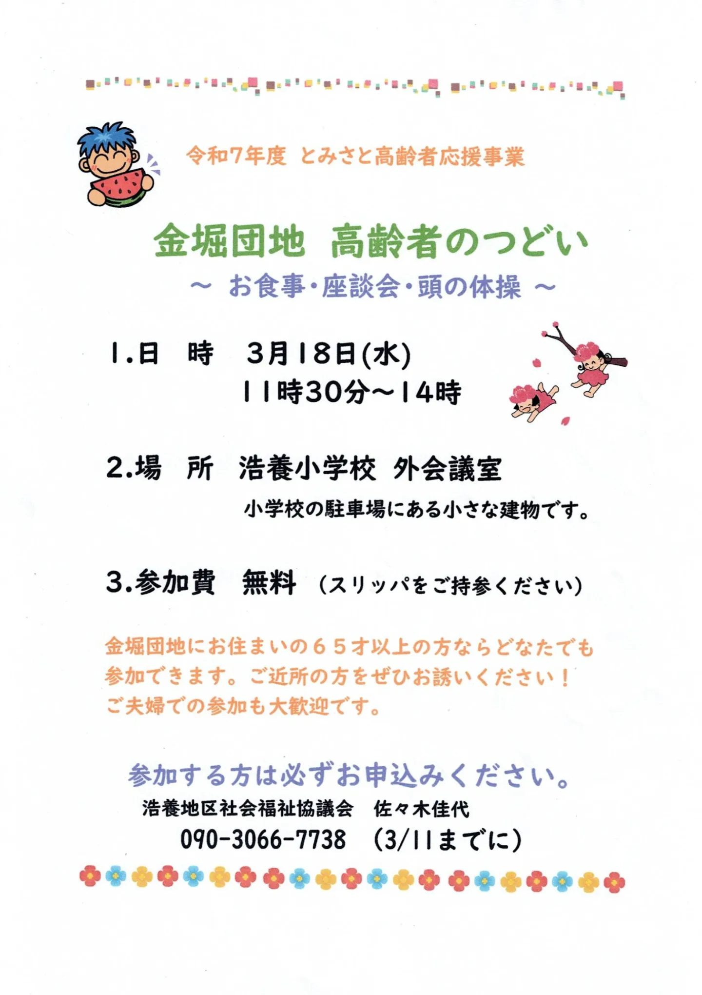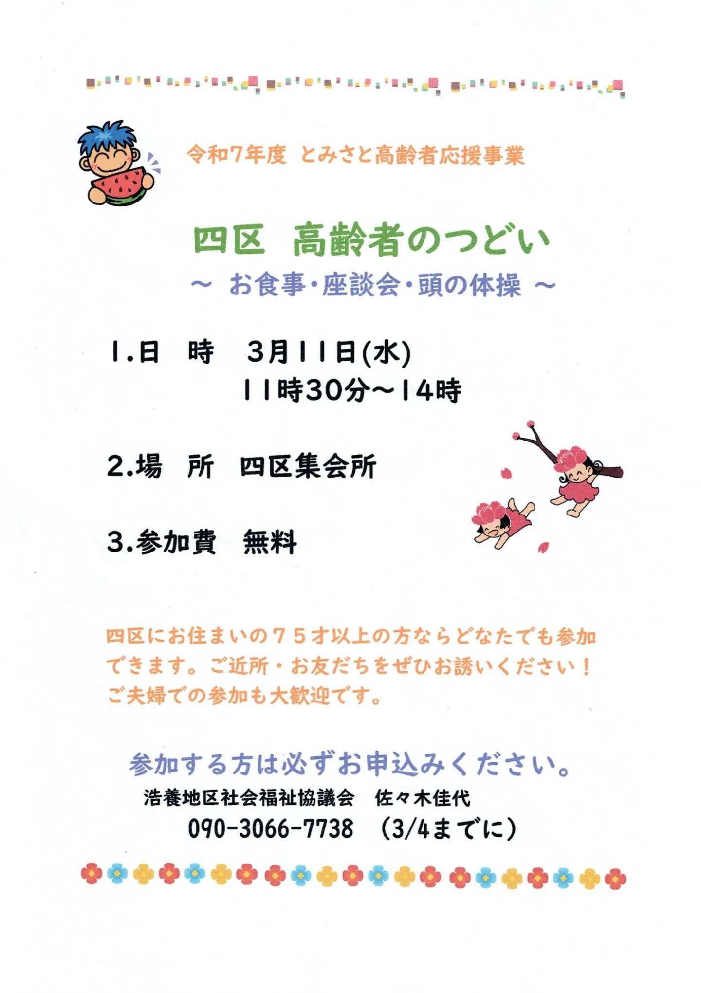 令和7年度「こうよう高齢者のつどい」を10~11月に開催しましたが、四区・金堀団地のご参加がなかったので、3月11日に四区、3月18日に金堀団地を対象に再度開催します。各地区にお住まいの方は、お申し込みのうえ、ぜひご参加ください。