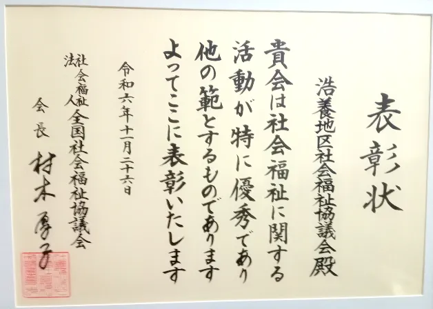このたび浩養地区社会福祉協議会では、令和6年度全国社会福祉協議会会長表彰において「社会福祉協議会優良活動」ならびに会員様1名の「永年勤続功労」の被表彰者に決定し、去る11月26日に東京の浅草公会堂にて開催された全国社会福祉大会において表彰状をいただきました。
