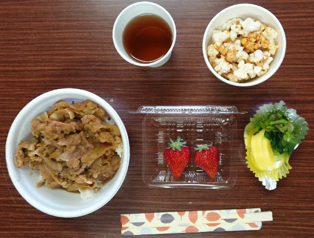 ■今回も豚丼がとても美味しかったです。いちごのデザートもポップコーンも美味しかったです。