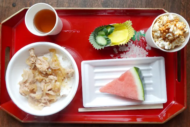 ■豚丼がとても美味しかったです。スイカのデザートもポップコーンもあり最高です。